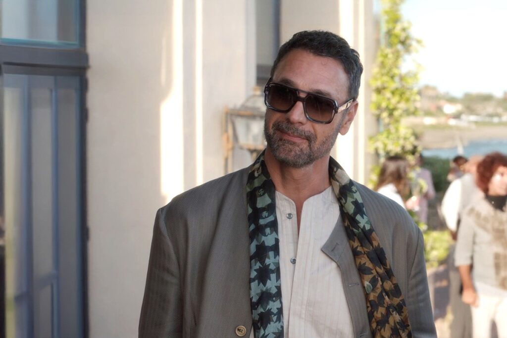 Giancarlo‘s teal and orange ombre scarf by Petrusse. Raoul Bova as Giancarlo on the Netflix series Emily In Paris.