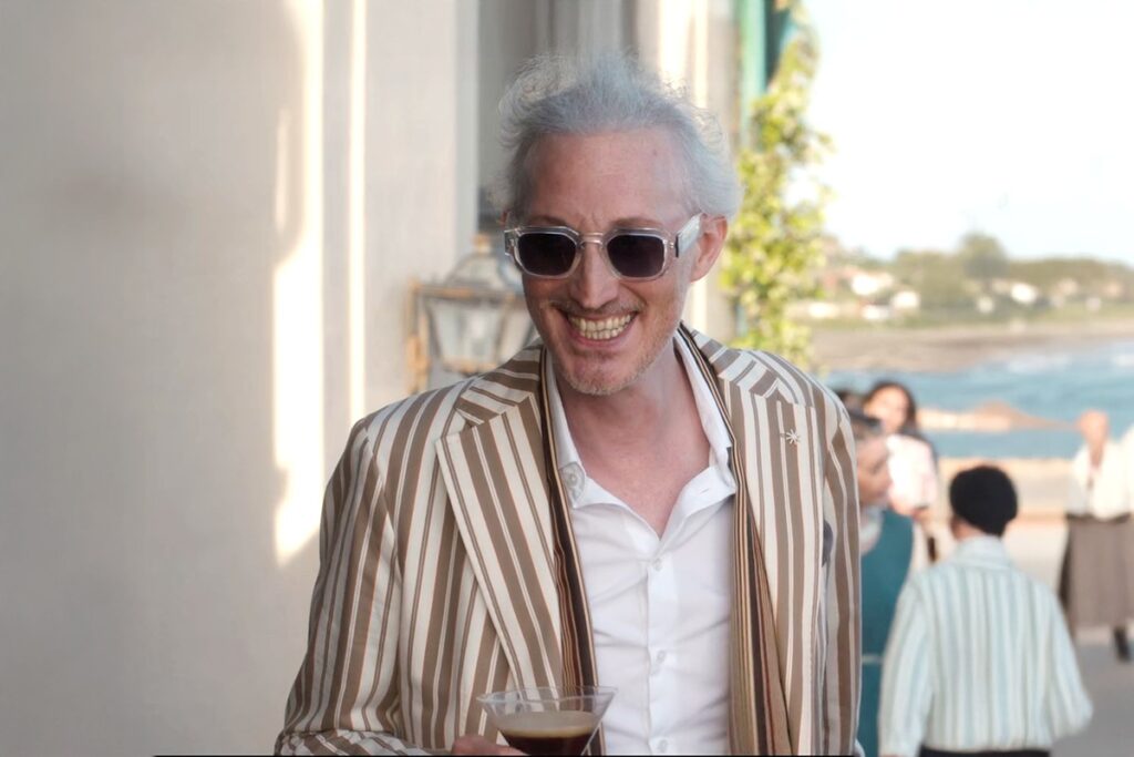 Luc‘s white and brown stripe jacket by Manuel Ritz. Actor Bruno Gouery as Luc the Netflix series Emily In Paris.